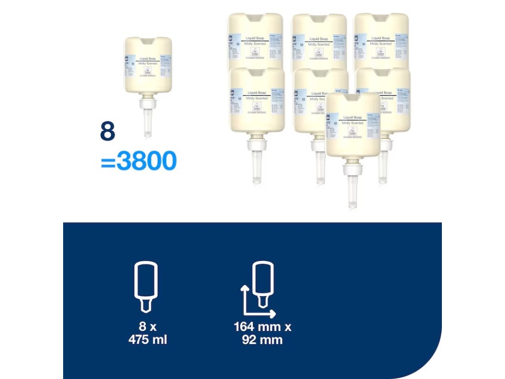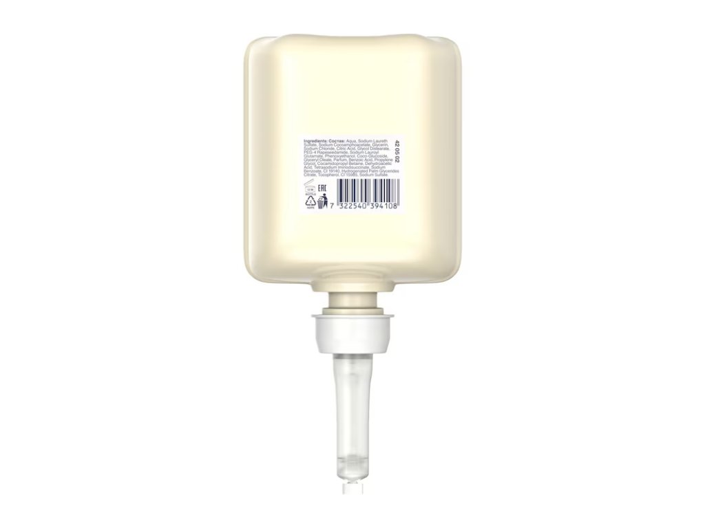 This fresh-scented hand soap has a dermatologically tested formula, skin-friendly pH and lipid-replenishing ingredients, meaning it has a creamy lather and moisturises the skin. Save staff time with effortless refilling – certified by the Swedish Rheumatism Association, tested according to the Design for All test, published in the Swedish Design Research Journal, 2011. Help secure good hand hygiene – the factory-sealed bottle with a new pump for every refill helps reduce the risk of contamination and protect the formulations all the way to the hands. Reduce waste – the bottle is collapsible, leading to 70% less waste volume (based on Essity test). Advantages at a glance: