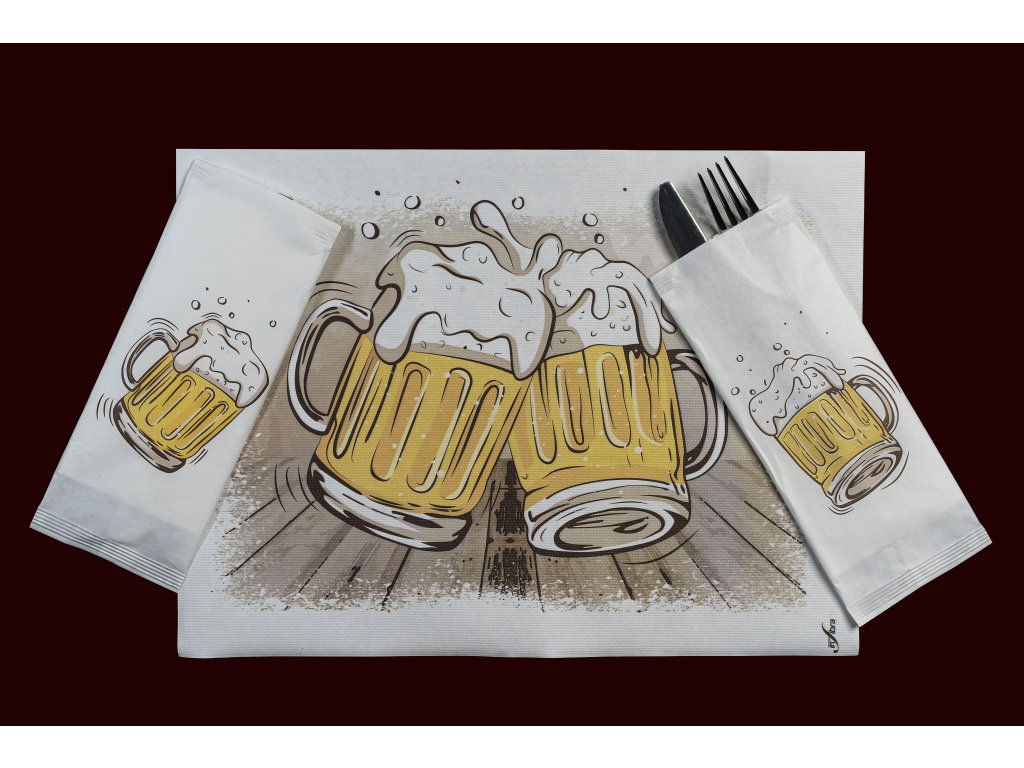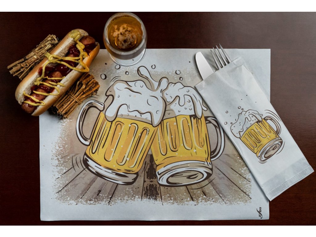 NOVINKA! Vysoce kvalitní zpevněná a uzavřená papírovo/polyethylenová kapsička na příbory Infibra New Beer s vloženým bílým dvouvrstvým ubrouskem 38x38cm, rozměr kapsičky 25x11cm