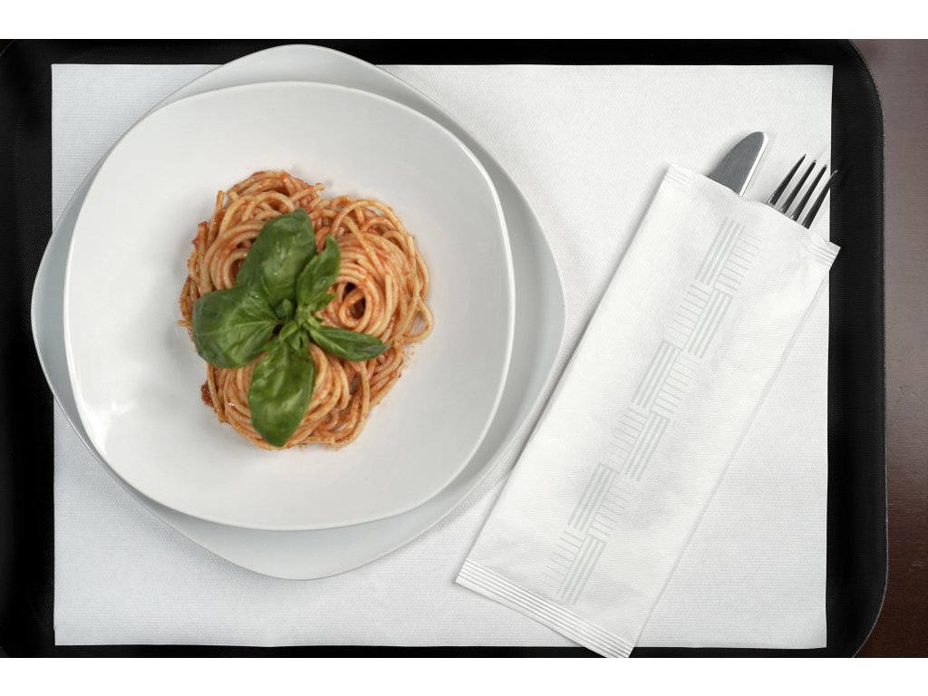NOVINKA! Vysoce kvalitní zpevněná a uzavřená papírovo/polyethylenová kapsička na příbory Infibra New White s vloženým bílým dvouvrstvým ubrouskem 38x38cm, rozměr kapsičky 25x11cm.