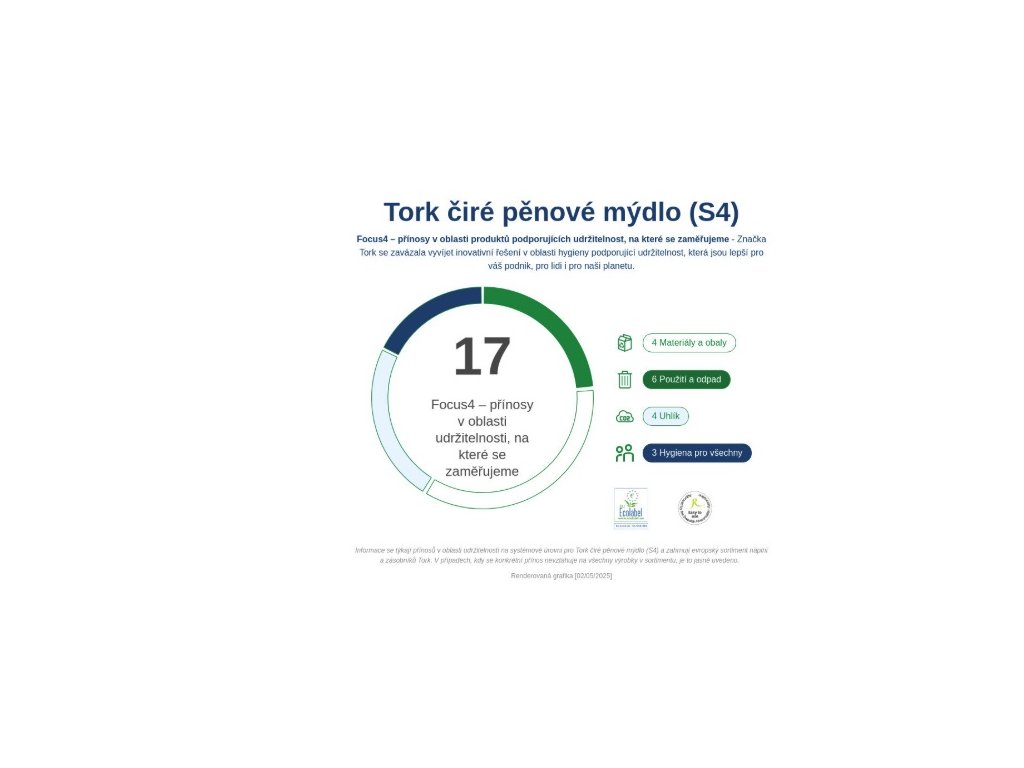Pěnové ekologické mýdlo TORK Premium Clarity je ideální pro použití na toaletách, kde podporuje zdravé a hygienické pracoviště s vysokou frekvencí návštěvníků. Šetrné k přírodě, protože 99 % složek je přírodního původu - 7 z 9 složek je rostlinného původu, 1 šetrná konzervační složka. Mycí složky pocházejí z obnovitelných zdrojů (rostlinného původu)Mycí složky nepředstavují dle prohlášení žádné nebezpečí pro životní prostředí. Množství mycích složek je sníženo o 70 % (povrchově aktivní látky). Účinnost čištění rukou zůstává stejná při stejné velikosti dávky. Nižší toxicita pro vodní organismy. Složení čirého mýdla je v souladu s ISO 16128.