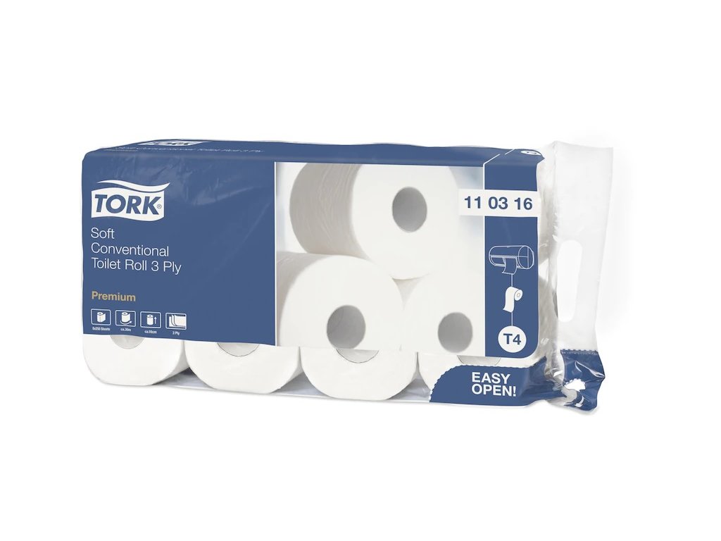 Prémiová dekorační ražba pro atraktivní vzhled a pocit většího objemu. Tork vylepšuje toaletní papír v konvenčních rolích v systému T4 o nové, udržitelnější obaly (Scanpack), přispívá tak k lepší efektivitě a podporuje odpovědnost vůči životnímu prostředí. Obaly Scanpack obsahují alespoň 30 % recyklovaného plastu (PCR) a vyznačují se kompaktnější velikostí balení a s tím související optimálnější paletizací