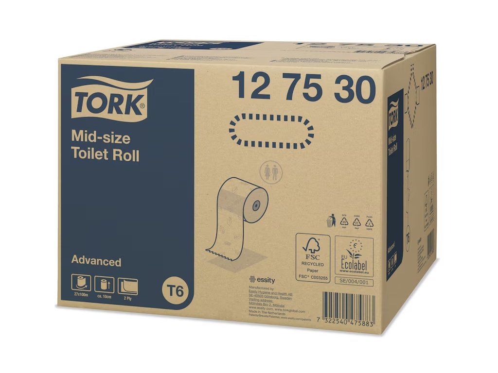 Systém Tork Mid-size Toilet Roll (T6) zajistí, že nikdy nedojde papír. Je vhodný pro oblasti se střední kapacitou a zařízení, která se zajímají o vzhled a pohodlí. Velmi dobrá kvalita papíru. Vysoká kapacita: zásobník na dvě role. Dekorační ražba s motivem listu: navržena pro skvělý dojem. Žádný odpad na podlaze: prázdné dutinky zůstávají v zásobníku.Znaky Tork Easy Handling: Snadné otevírání, snadné přenášení a snadné složení kartonu. Automatický posun role. Vysoce kvalitní dvouvrstvá role obsahuje 100 metrů toaletního papíru. Bílý papír není perforovaný, a tím snižuje riziko zaseknutí papíru uvnitř zásobníku. Každá role je chráněna hygienickým obalem, kde najdete jednoduché instrukce k doplňování.