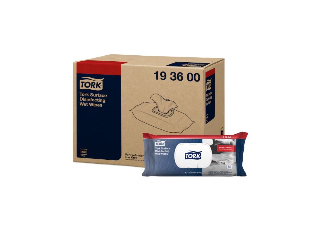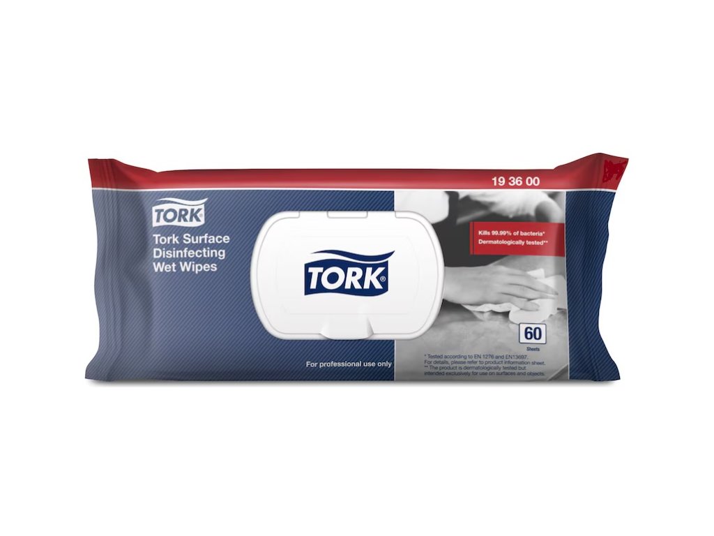 Tork vlhčené utěrky na dezinfekci povrchů představují dezinfekční prostředek připravený k použití, který účinkuje proti širokému spektru bakterií včetně koronaviru. Jsou dermatologicky testované a vhodné na tvrdé neporézní povrchy a předměty. Prodávají se v balení flowpack po 60 utěrkách se znovu uzavíratelným víčkem, které pomáhá chránit vlhkost utěrek.